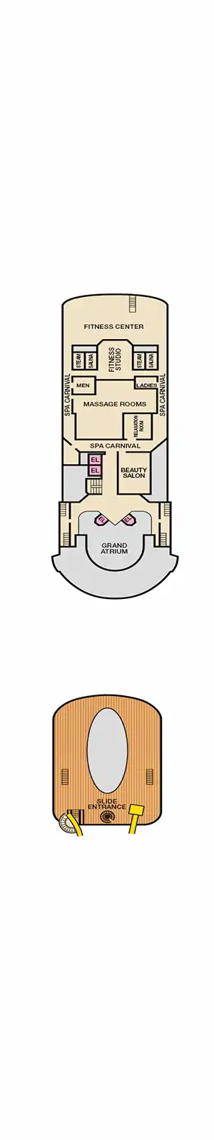 Dos camas bajas convertibles en una cama King. Colchones de diseño exclusivo para Carnival. Ventanales, terraza exterior, ropa de cama de hilado superior. Amplio cuarto de baño con ducha, sala de estar. Productos de baño, suaves alfombras, control climático, teléfono, TV con canales internacionales. Servicio nocturno de preparado de cama incluyendo chocolatina o galletas con chispa para los niños.