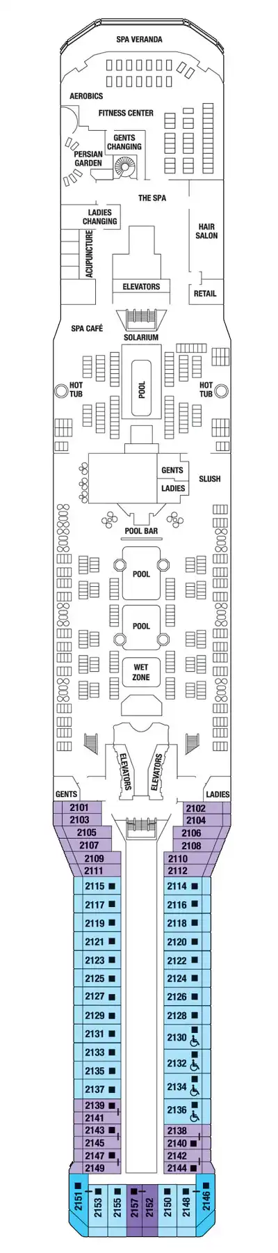 Estos camarotes con balcón están influenciados por los elementos más relajantes de los spa además de ofrecer acceso exclusivo al Blu, nuestro restaurante de especialidad más espectacular. Además, estos camarotes ofrecen acceso exclusivo a la AquaSpa® Relaxation Room y al Persian Garden (solo en la Clase Solstice) . Si te gusta la tranquilidad, no hay mejor manera de viajar.