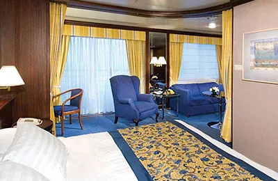 Aprox. 35m², balcón incluido. 2 camas bajas que forman 1 cama tamaño queen, baño con tocador de lavamanos doble, bañera y ducha grande con hidromasaje y ducha adicional, amplia sala de estar, terraza privada, 1 sofá cama para 1 personas, ventanas panorámicas. Incluye todas las comodidades del camarote más variedad de almohadas, minibar a su cargo, toallas de baño extragrandes, servicio telefónico de conserjería, biblioteca de DVD de cortesía