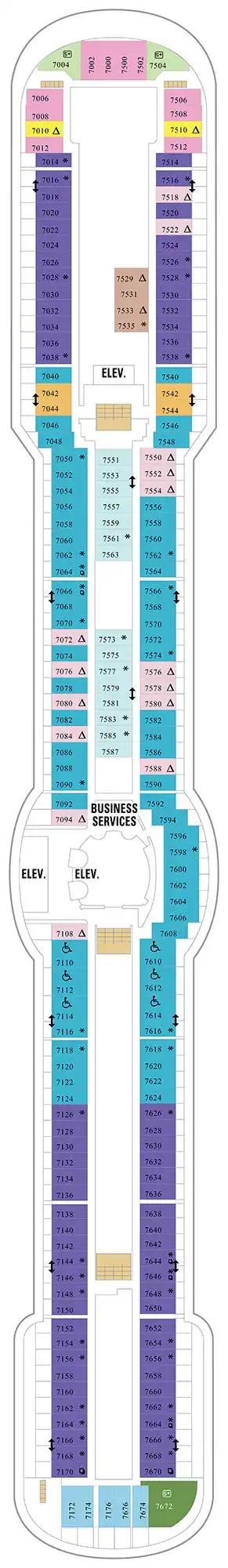 Esta cabina posee Balcón privado, comedor con sofá cama, dos camas individuales o una cama Royal King, sábanas de lujo, TV, teléfono y cajafuerte, baño privado con ducha, área de maquillaje y secador de pelo, servicio en camera disponible las 24 horas.
